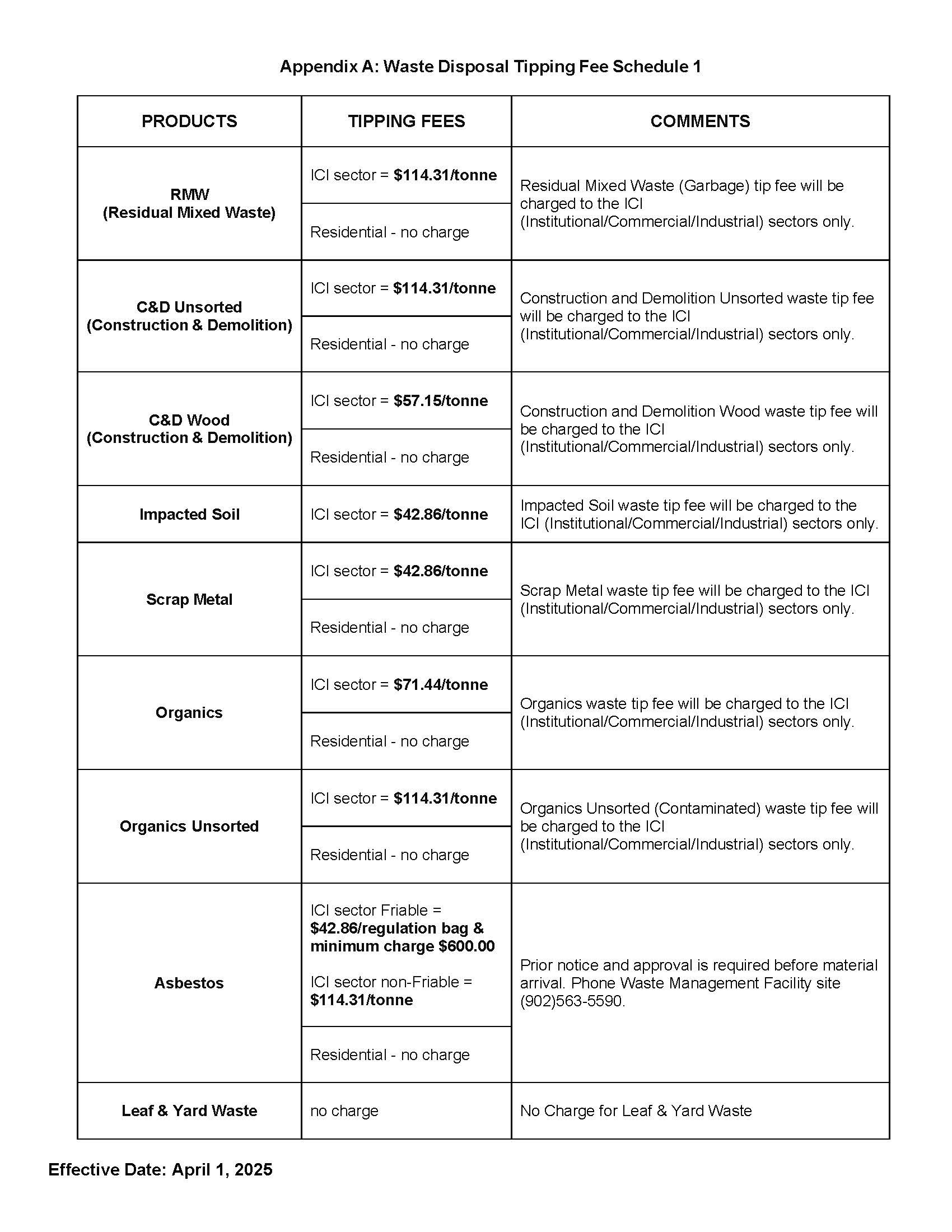 As outlined in the CBRM Solid Waste Management Policy, tipping fees are reviewed and adjusted annually on April 1.